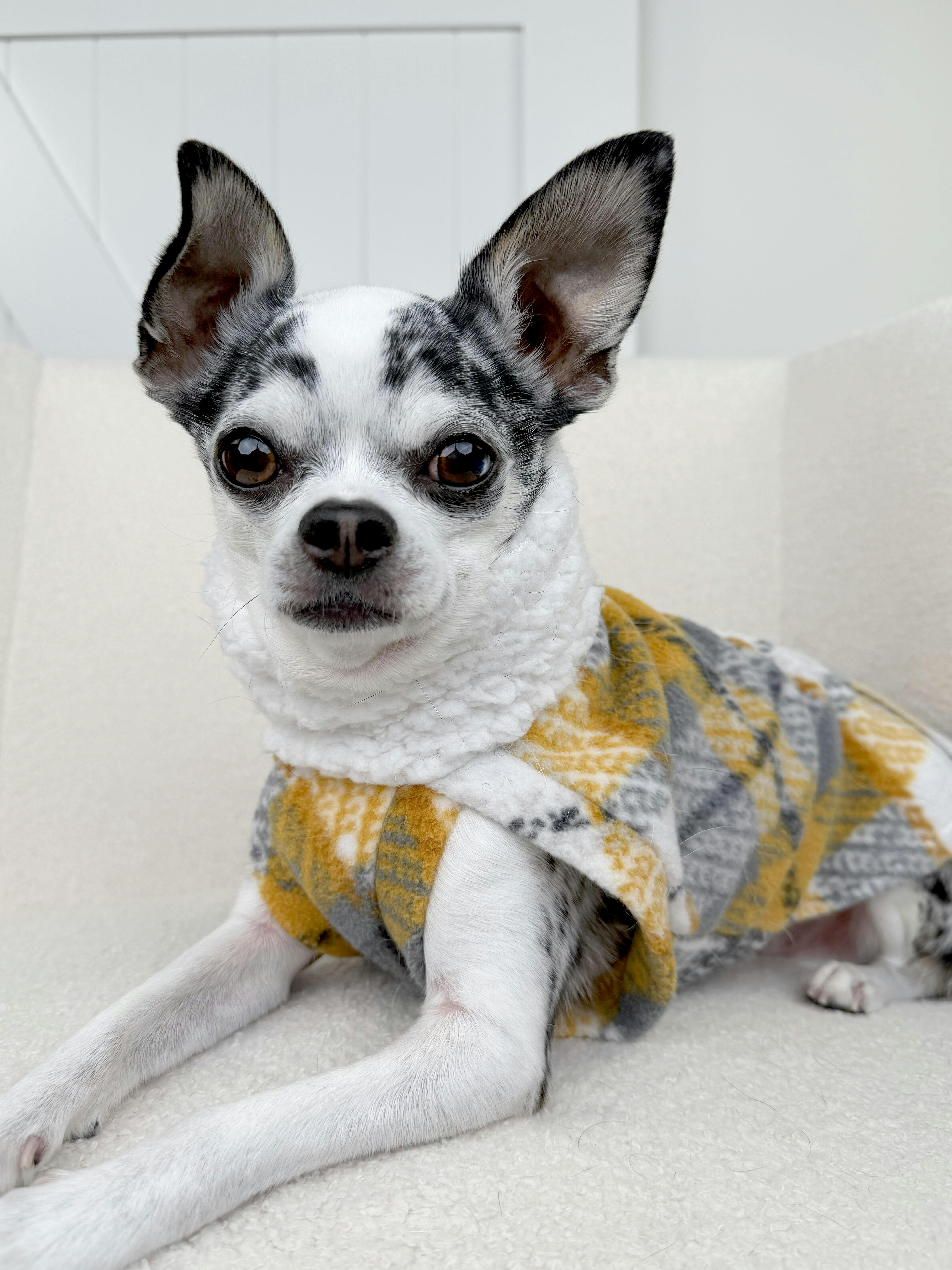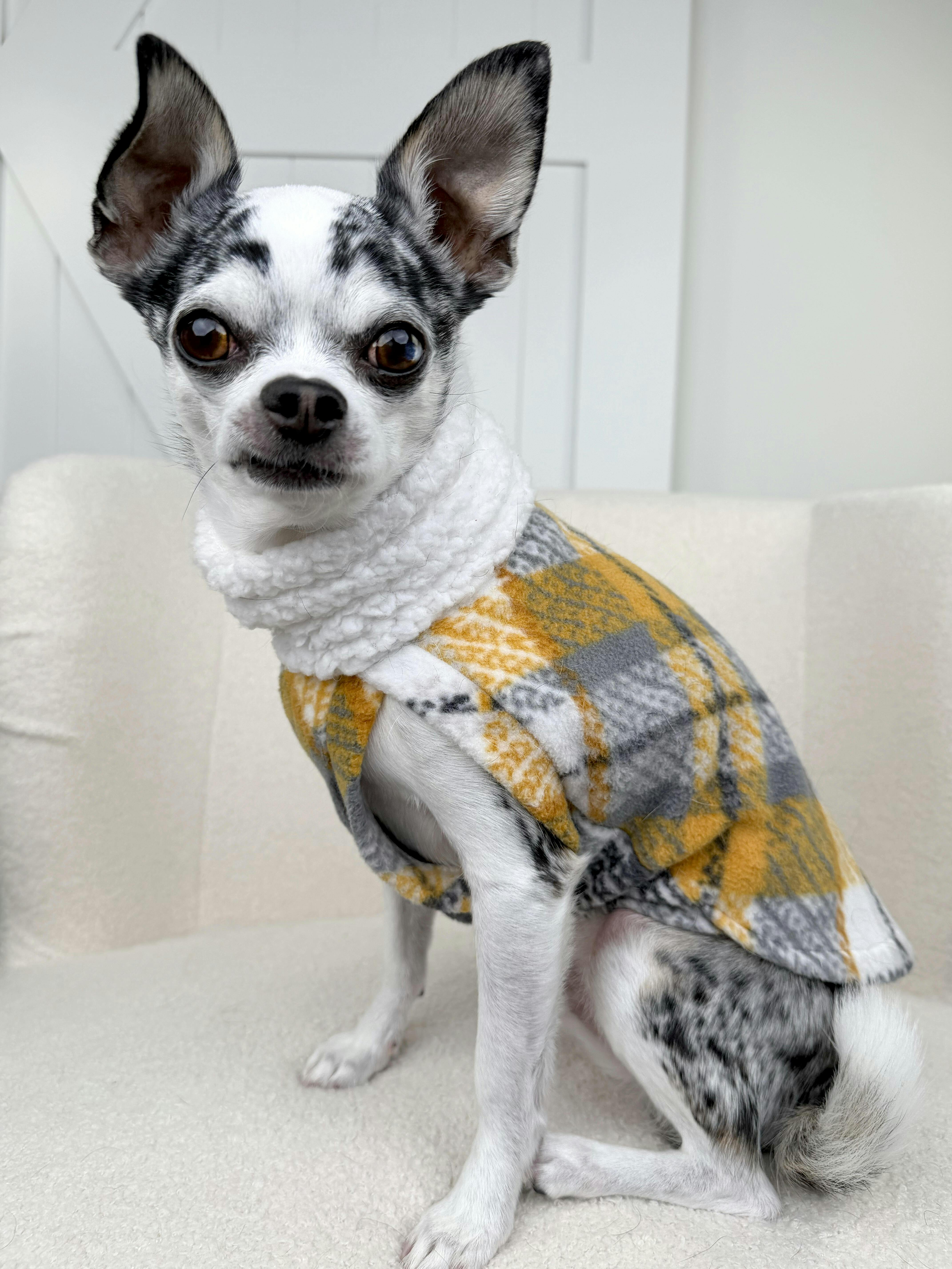 This is hands down our favorite sweater of the season. The Gray & Yellow Plaid Dog Sweater with Faux Sherpa Turtleneck is aesthetic perfection. The fit is spot on, it’s ultra soft with just the right amount of stretch, and it’s actually warm enough for my little guy to nap in. The fleece pullover is cozy without being bulky, and the sherpa collar adds that extra winter charm. He wears it around the house, on walks, and straight to bed. It’s become part of his rotation and honestly, I wish they made one in my size. Cozy, cute, and totally Kylo approved.
