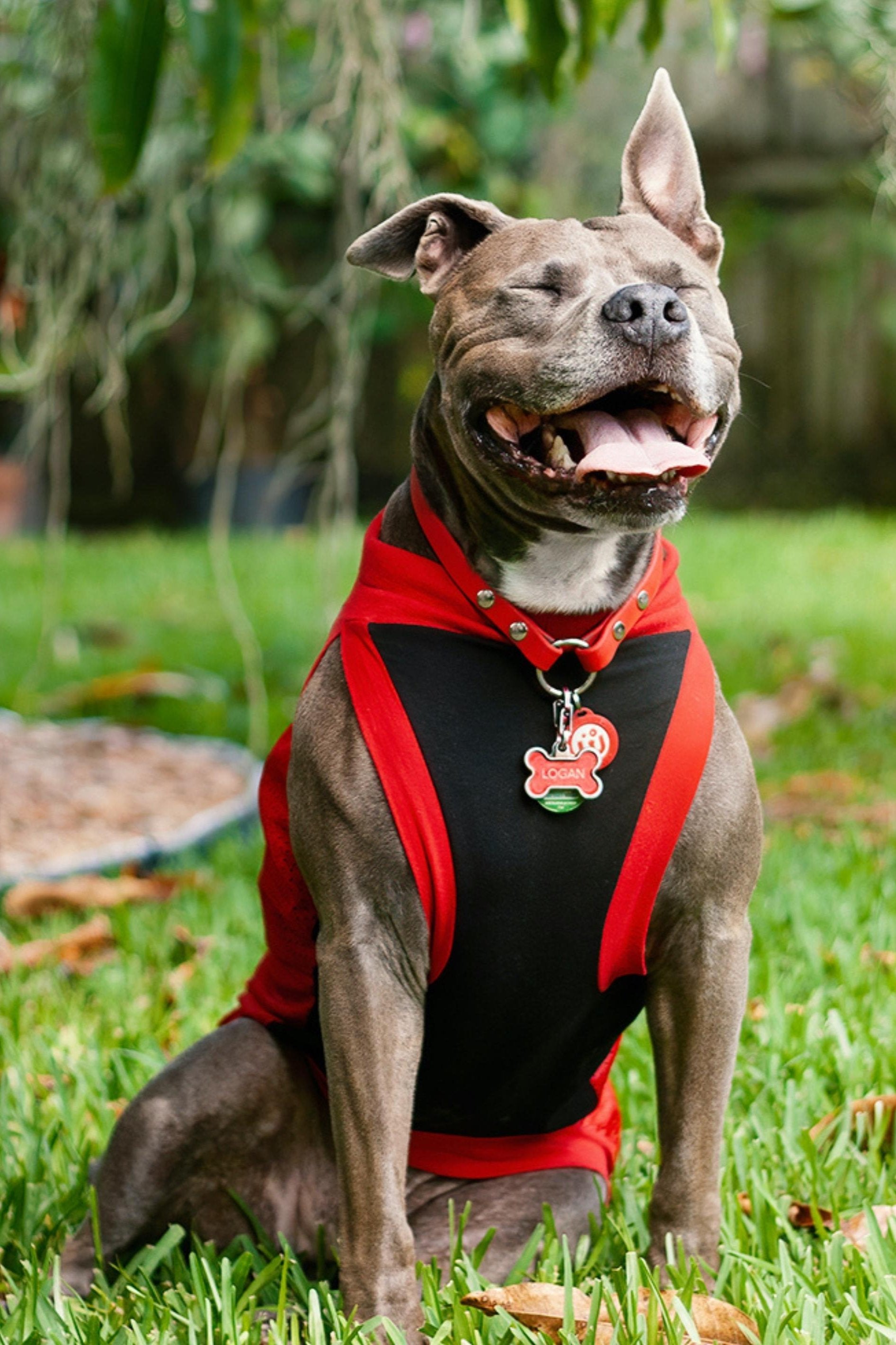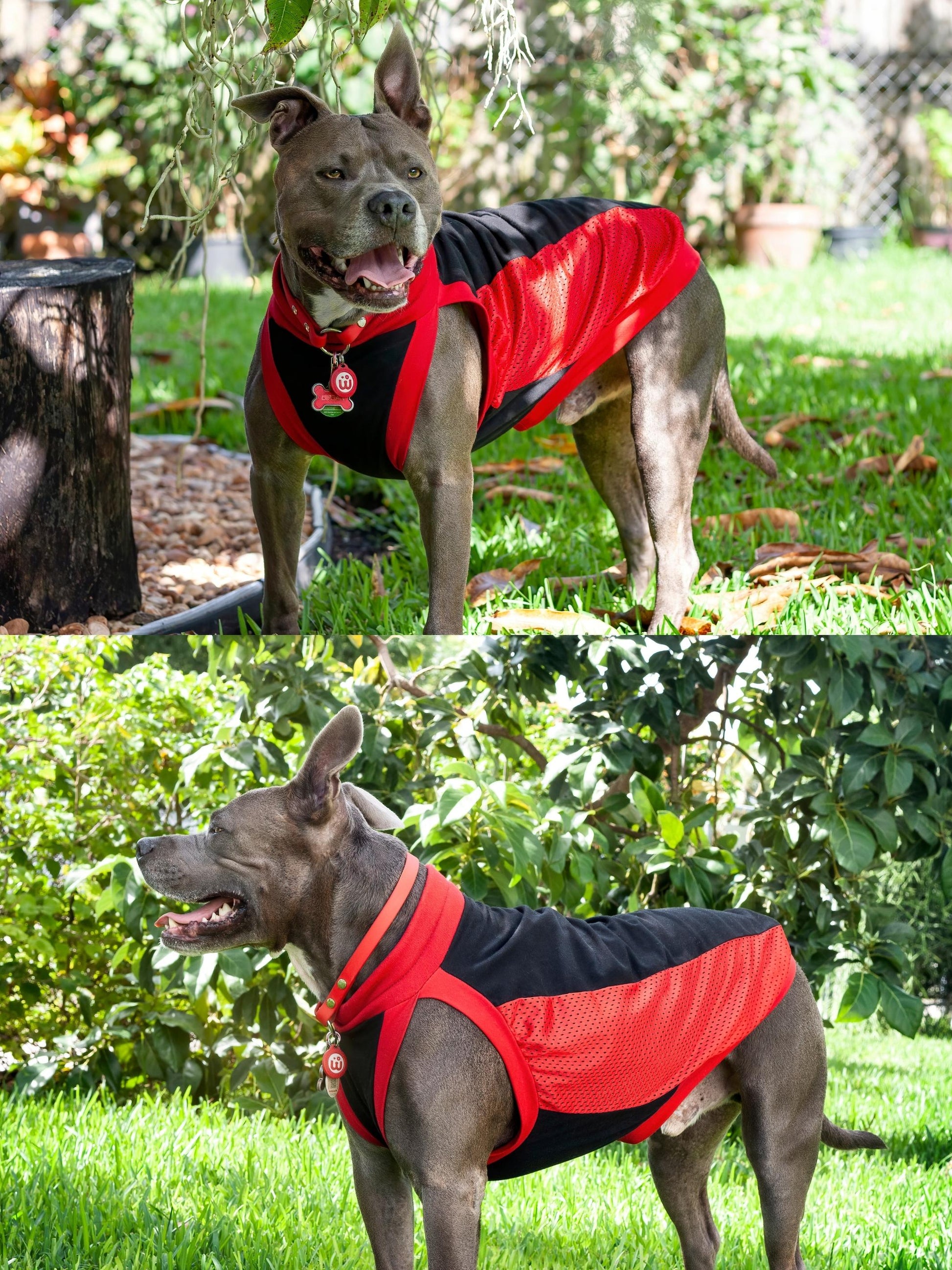 Boost your dog's game day presence with our Ultimate Dog Sports Jersey. Constructed from luxurious cotton spandex and breathable mesh, this jersey flaunts a black body, red mesh sides, and red trim around the neck, sleeves, and waistband to echo the hues of a popular basketball team. Customize it with a unique name and number on our Personalized Jersey page for that special touch!